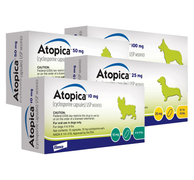 Atopica™ is indicated for the control of atopic dermatitis in dogs. Atopica™ contains Cyclosporine, an immunomodulator. Cyclosporine has anti-inflammatory and anti-pruritic activities in atopic dermatitis, which is one of the most common allergic skin diseases in dogs and is caused by allergens such as house dust mites or pollens which stimulate an exaggerated immune response in atopic dogs. Reduces the inflammation and itching associated with atopic dermatitis Treatment for chronic atopic dermatitis in dogs For dogs over 4 lbs and at least 6 months of age Does not contain steroids