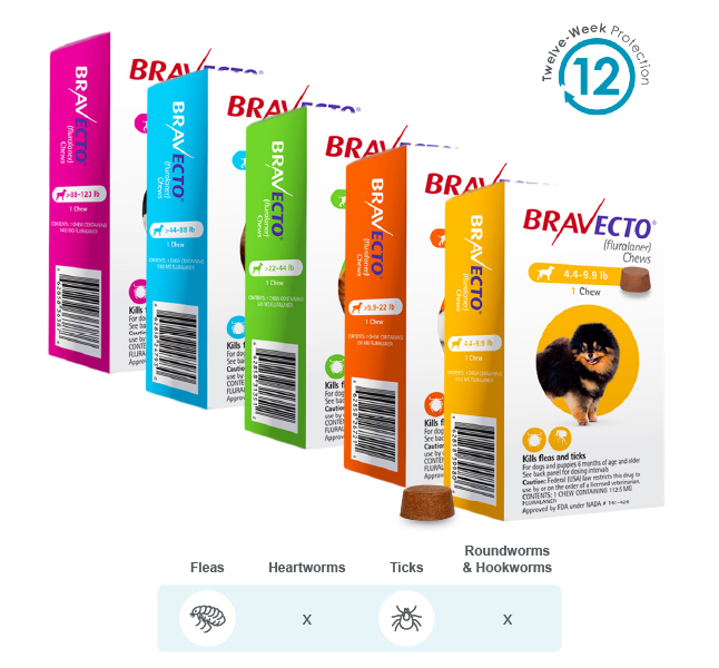 BRAVECTO® (fluralaner) Chews for dogs is the #1 longest-lasting chew* for powerful flea and tick protection. Easy and convenient to administer, just one dose of vet-recommended and FDA-approved BRAVECTO starts killing fleas and ticks within hours, prevents flea infestations, kills ticks (black-legged tick, American dog tick, brown dog tick and Asian longhorned tick) for 12 weeks* and kills lone star ticks for 8 weeks. BRAVECTO® is for use in dogs and puppies 6 months of age and older and weighing 4.4 pounds and greater. Available by prescription only. Fast-acting, safe and easy treatment Up to 12 weeks* of flea & tick protection with just 1 chew! Tasty pork flavored chew Available in five sizes based on your dog's weight Proudly sourced directly from the manufacturer or their approved distributor. Guaranteed genuine and backed by the manufacturer.