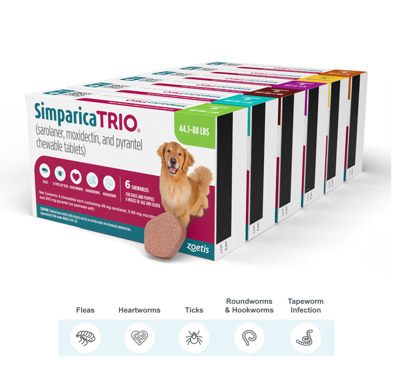 Simparica Trio® Chewable Tablets are a once-a-month chewable that protects your dog against heartworm disease, ticks & fleas, roundworms, hookworms, and tapeworms with three proven ingredients designed for defense. It’s available from your vet with a prescription and comes with a 100% satisfaction guarantee. Simparica Trio is for use in dogs and puppies 8 weeks of age and older, and weighing 2.8 pounds or greater. Protects dogs against heartworm disease for 30 days. Prevents flea infestation by killing fleas before they can even lay eggs. Starts killing within 4 hours. Treats and controls roundworms and hookworms to protect your dog from intestinal parasites. Proven to kill 6 types of ticks: Lone Star tick, Gulf Coast tick, American dog tick, black-legged tick, brown dog tick, and deer ticks Now prevents tapeworm infections