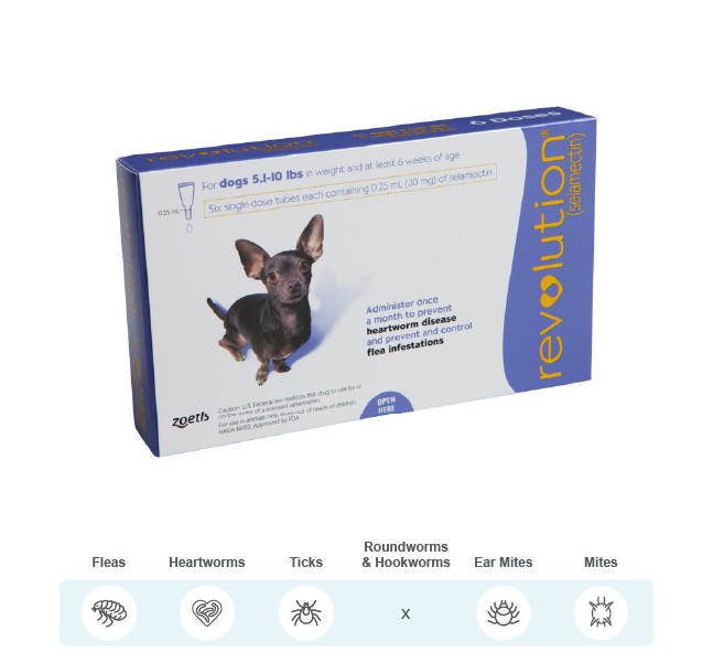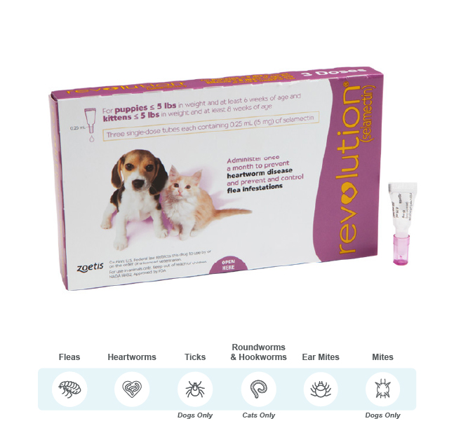 Revolution® for Dogs is a convenient, monthly topical treatment providing comprehensive protection from several parasites including heartworms, fleas and ticks in dogs. It kills adult fleas and prevents flea eggs from hatching for a full month and is indicated for the prevention and control of flea infestations. Revolution® also treats sarcoptic mange and ear mites in dogs. Revolution® for Cats is a monthly topical formulation which treats and prevents fleas, heartworms and other harmful parasites. It kills fleas, flea eggs and larvae to keep your feline flea-free. Revolution also prevents heartworm disease in cats. It is also effective in controlling ear mites and in treating hookworms and roundworms in cats. Easy to dose, low-volume, non-greasy, quick-drying formulation in a convenient once-monthly dose