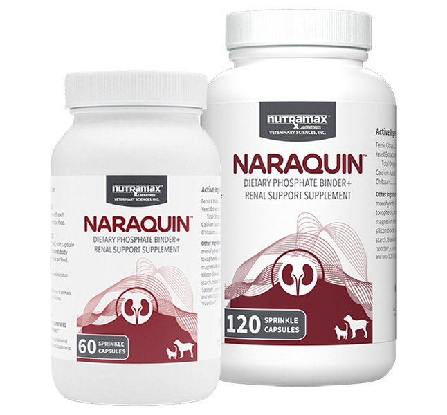 Naraquin™ is a dietary phosphate binder and renal support supplement. Formulated with a proprietary blend of 3 phosphate binders: ferric citrate, calcium acetate, and chitosan Includes omega-3 fatty acids and beta glucans to support renal health Available in capsule form to provide easy administration & accuracy when measuring 60 and 120 count bottles